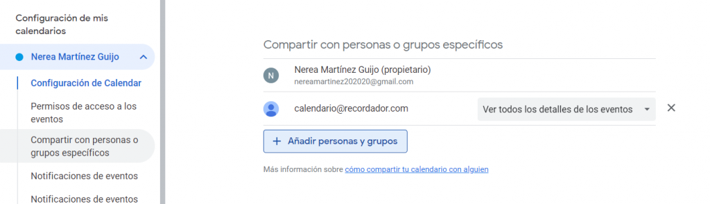2. Abajo a la izquierda pulsa en tu cuenta de calendario y ve a la sección de «Compartir con otras personas o grupos específicos».