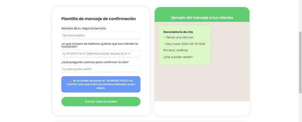 Rellena la plantilla con el nombre del negocio, el número de teléfono al que quieres que tus clientes te contacten y redacta la pregunta que quieres que aparezca en los mensajes de confirmación (ej.: ¿vas a poder asistir?). No te preocupes, solo te llevará 2 minutos y lo podrás editar en cualquier otro momento. En esta página podrás ver un ejemplo de cómo se verá el mensaje que les llegue a tus clientes. Asegúrate de “guardar todos los ajustes” antes de pasar al siguiente paso.