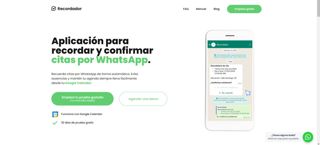 Ya está todo, así de fácil. Te animamos a que crees tu primer evento en Google Calendar o en el calendario de Recordador con una cita de un cliente, añadiendo su teléfono en el título del evento. Es muy importante que el teléfono tenga el prefijo del país pero sin el “+”, y a continuación el resto de números sin espacios.